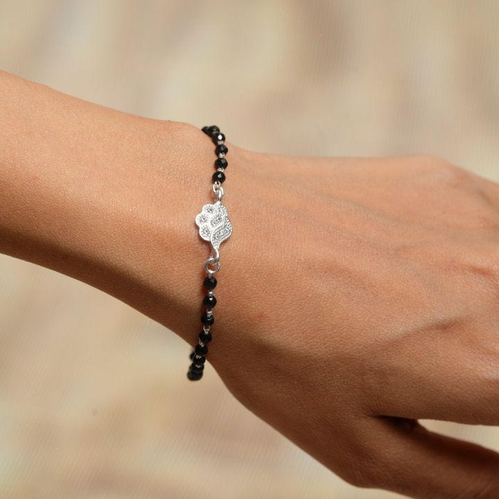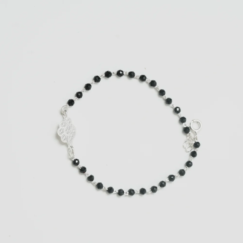 The bracelet consists of a fine strand of faceted black beads that shimmer slightly in the light. The focal point is a petite, abstract charm—reminiscent of a floating cloud or stylized flower—completely encrusted with pave-set clear crystals. Finished with a secure silver clasp and extender chain, it ensures a perfect fit for any wrist size, making it great for stacking or wearing solo.