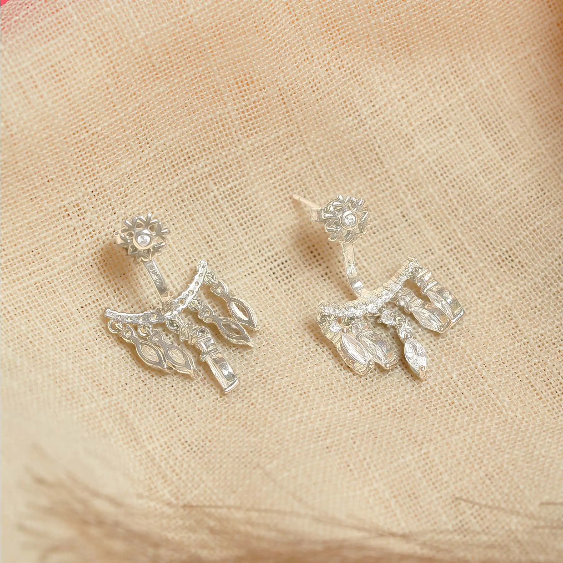Description: Redefine your ear game with our Floral Stud & Marquise Fringe Ear Jackets, a chic blend of minimalist charm and modern design. Handcrafted in 92.5 Sterling Silver, the top component is a sweet, flower-shaped stud set with a central sparkling stone, which can often be worn alone for a simple look.