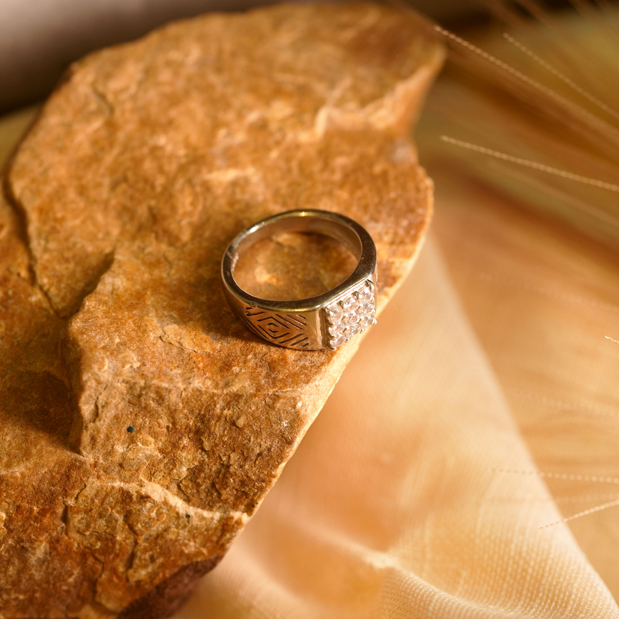 Description: Add a touch of architectural edge to your look with our Geometric Chevron & Crystal Square Band Ring. Handcrafted in premium 92.5 Sterling Silver, this ring combines the classic appeal of a signet style with contemporary design elements.