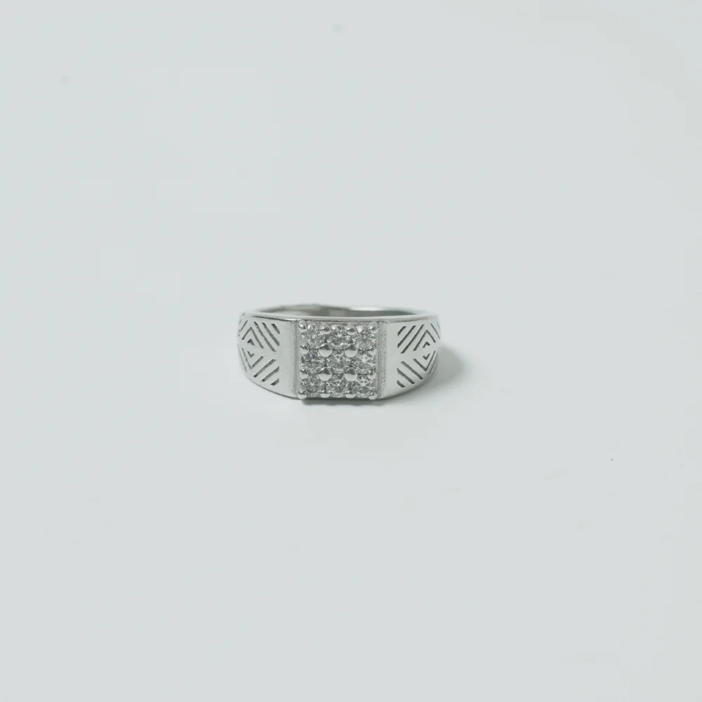 The focal point is a defined square centerpiece, densely packed with micro-pave clear crystals that catch the light from every angle. The wide silver band is meticulously engraved on both sides with geometric chevron or triangular lines, directing the eye toward the central sparkle and adding a dynamic texture to the polished metal. Robust and stylish, this ring is designed for those who love jewelry with a strong, modern character.