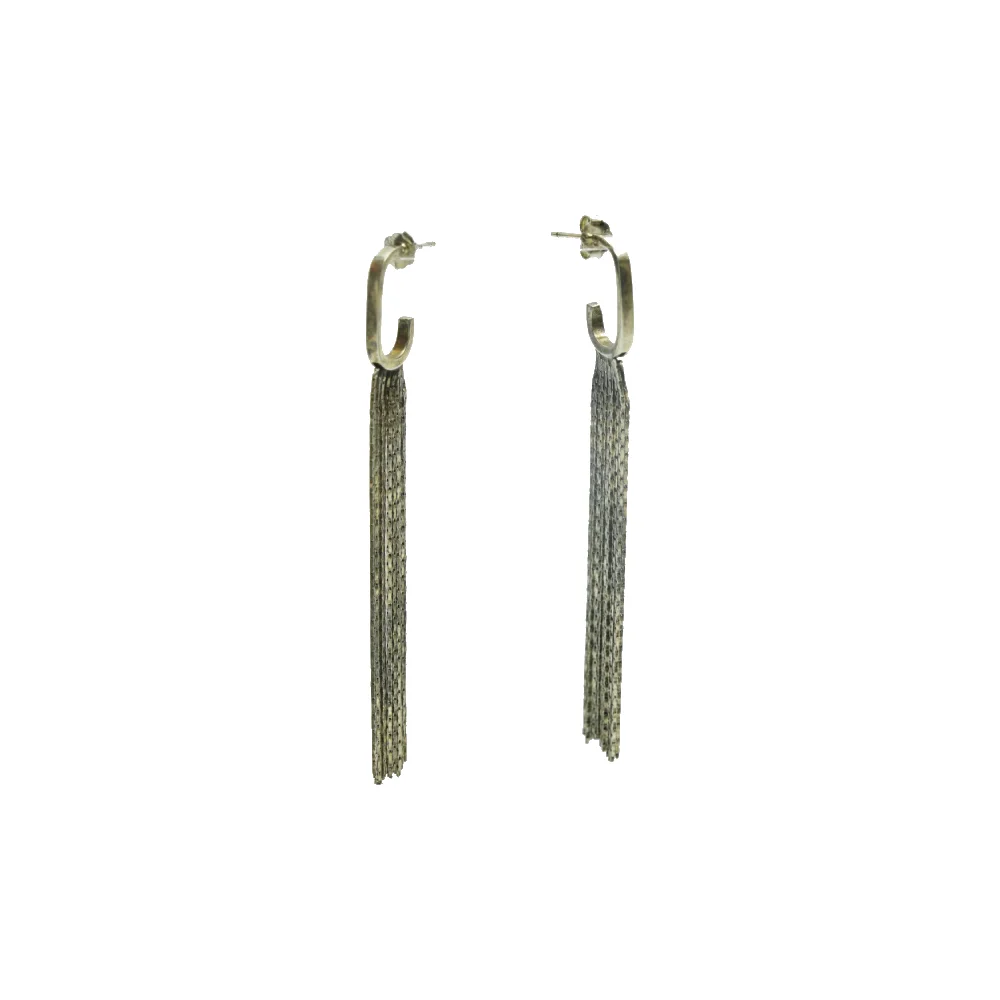 Dropping from this geometric frame is a rich fringe of darkened, textured silver chains. Unlike traditional fluid tassels, these chains have a structured, almost industrial quality that hangs in a straight, defining line. The deep oxidized finish enhances the texture of the chains, creating a striking contrast that pairs exceptionally well with leather jackets, blazers, or minimalist evening wear.