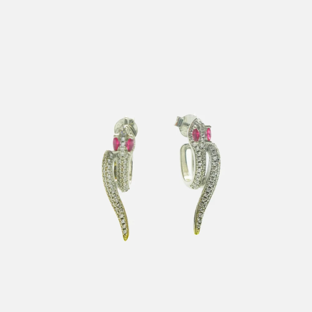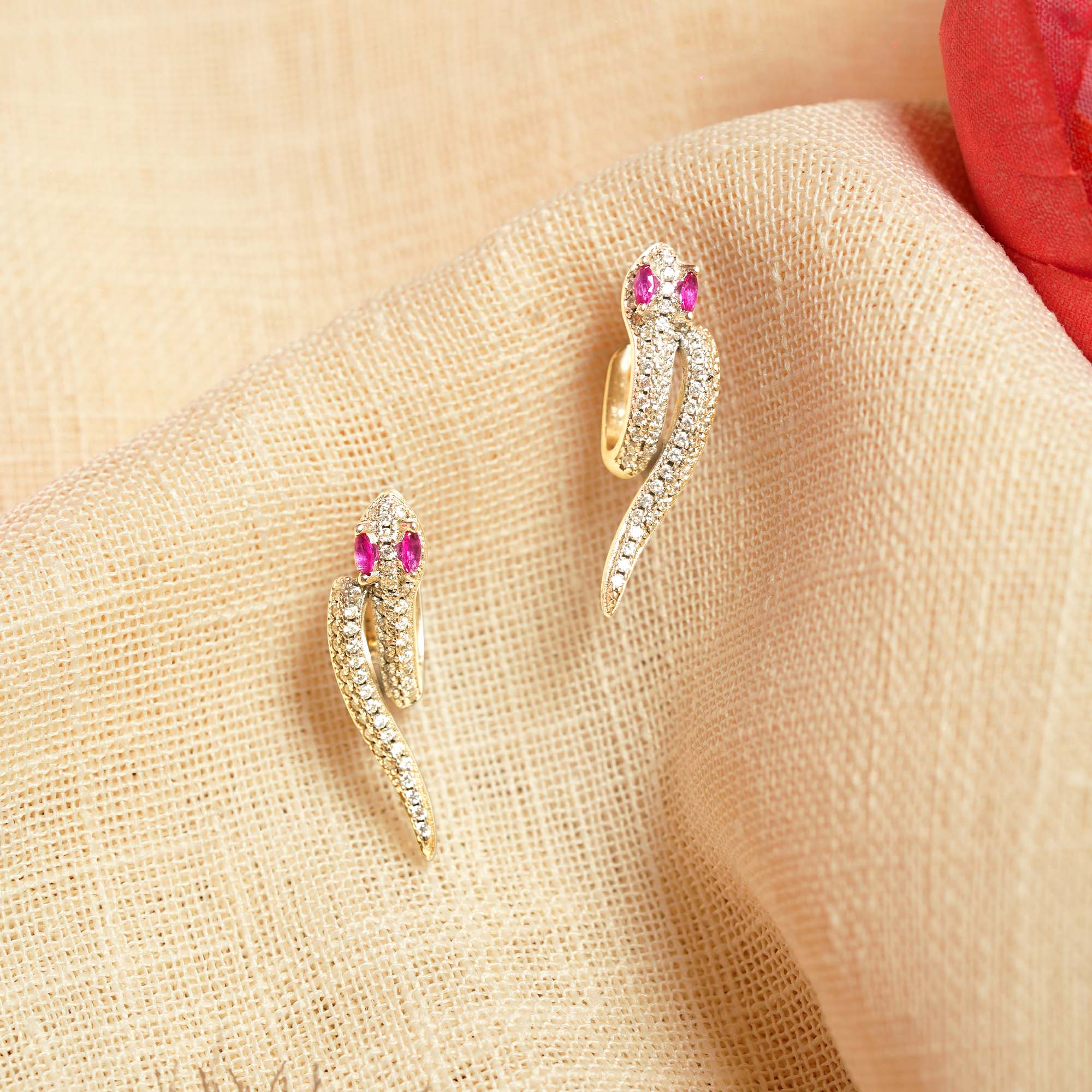 The body of the serpent is encrusted with micro-pave set clear crystals, mimicking the shimmering scales of a snake and catching the light with every movement. The design is brought to life with two piercing marquise-cut ruby-pink stones set as the eyes, adding a fierce and hypnotic gaze to the piece. Whether you want to add a rebellious touch to a formal gown or elevate a casual outfit, these earrings are the ultimate statement of confidence.