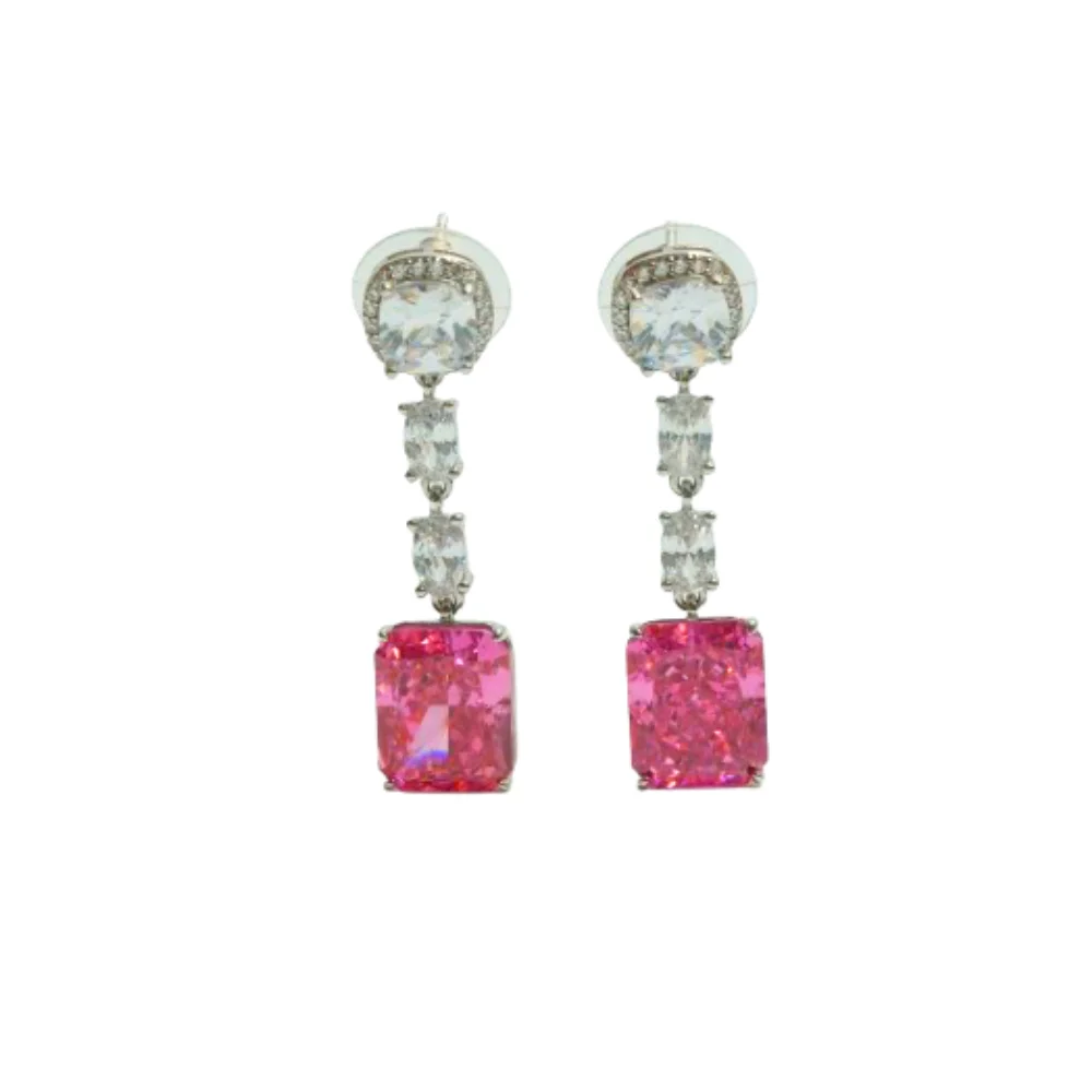 Cascading downwards are two faceted oval clear crystals that lead to the pièce de résistance: a large, captivating emerald-cut pink stone. The combination of the icy white sparkle and the vibrant pink hue creates a romantic and opulent look. Set in high-polished silver, these linear drop earrings provide a dramatic length that beautifully frames the face, making them an ideal choice for weddings, galas, or red-carpet moments.